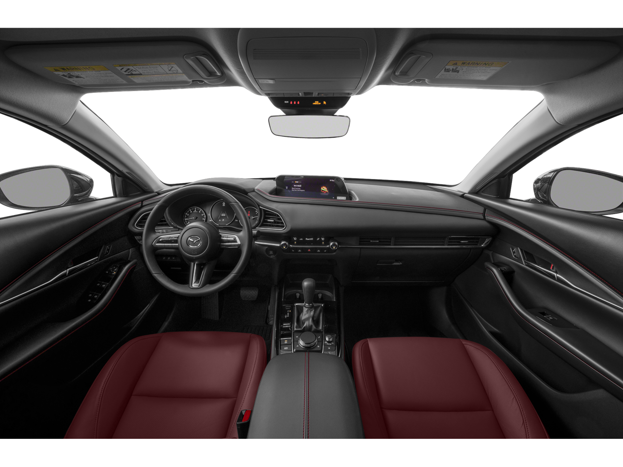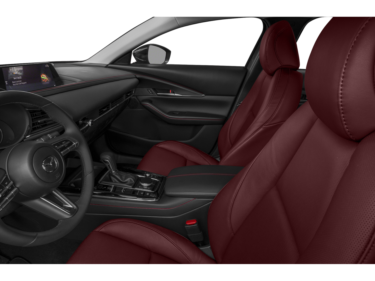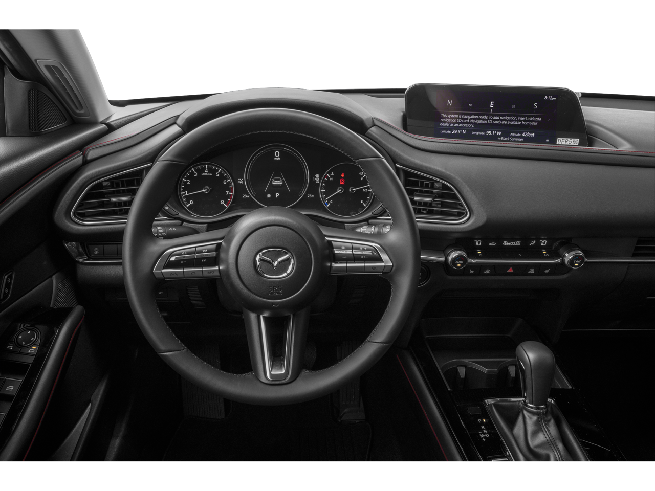 This CX-30 is well Equipped with 4-Wheel Disc Brakes, 4.095 Axle Ratio, 8 Speakers, ABS brakes, Air Conditioning, Alloy wheels, AM/FM radio, AppLink/Apple CarPlay and Android Auto, Auto High-beam Headlights, Automatic temperature control, Brake assist, Bumpers: body-color, Compass, Delay-off headlights, Driver door bin, Driver vanity mirror, Dual front impact airbags, Dual front side impact airbags, Electronic Stability Control, Emergency communication system: Mazda Connected Services (3-year complimentary trial included), Exterior Parking Camera Rear, Frameless Auto-Dim Mirror w/HomeLink, Front anti-roll bar, Front Bucket Seats, Front Center Armrest, Front dual zone A/C, Front reading lights, Front wheel independent suspension, Fully automatic headlights, Heated door mirrors, Heated Front Bucket Seats, Heated front seats, Illuminated entry, Knee airbag, Leather Seat Trim, Leather Shift Knob, Leather steering wheel, Low tire pressure warning, MAZDA CONNECT Infotainment System, Memory seat, Occupant sensing airbag, Outside temperature display, Overhead airbag, Overhead console, Panic alarm, Passenger door bin, Passenger vanity mirror, Power door mirrors, Power driver seat, Power moonroof, Power steering, Power windows, Radio data system, Radio: AM/FM/HD Audio System, Rain sensing wipers, Rear seat center armrest, Rear side impact airbag, Rear window defroster, Rear window wiper, Remote keyless entry, Speed control, Speed-sensing steering, Split folding rear seat, Spoiler, Steering wheel mounted audio controls, Tachometer, Telescoping steering wheel, Tilt steering wheel, Traction control, Trip computer, Turn signal indicator mirrors, Variably intermittent wipers, and Wheels: 18 x 7J Aluminum Alloy.